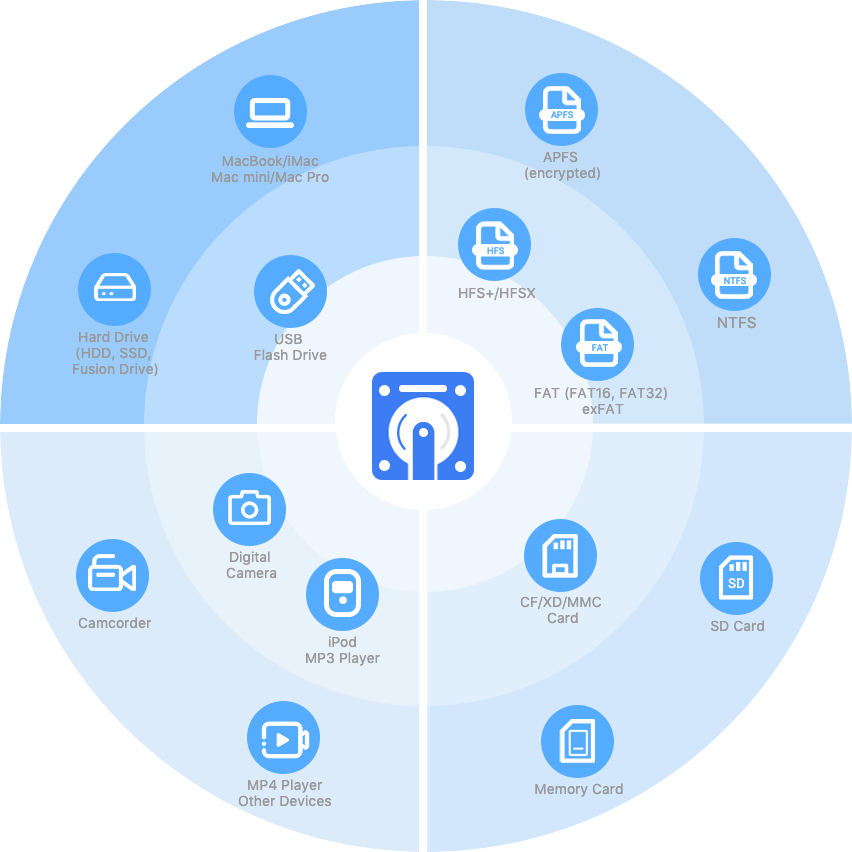 Récupérez les fichiers de n'importe quel périphérique Mac, disque dur interne/externe, lecteur USB, appareil photo numérique, carte SD, carte CF, etc. Il prend également en charge les systèmes de fichiers tels que APFS, HFS+, FAT16, FAT32, exFAT, NTFS, etc.