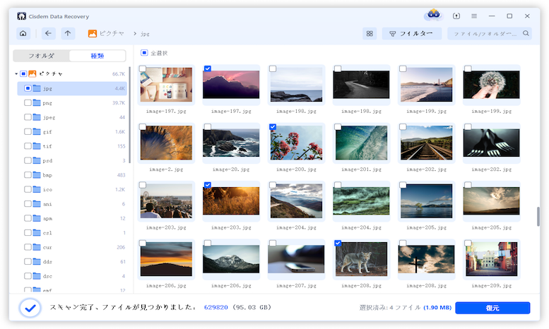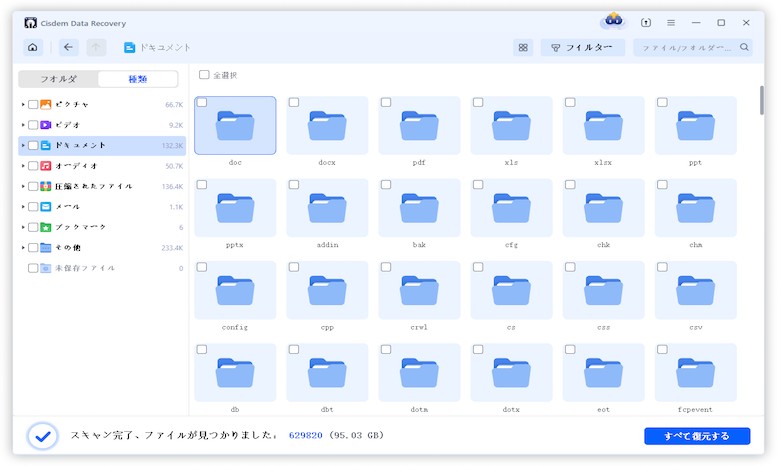 最先端データ復元専門ツールで、あらゆる原因によるデータ消失に対応し、すべてのストレージデバイスから削除した/消えたデータを復元できます。