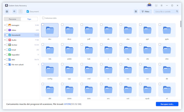 Questo strumento di recupero dati può recuperare quasi tutti i tipi di file: documenti, foto, video, audio, archivi, e-mail e altri formati di file.