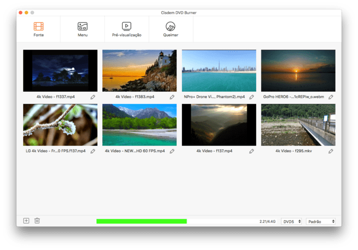 Cisdem DVD Burner suporta gravar DVD de quase todos os vídeos, tais como MP4, AVI, MOV, MKV, WMV, MPEG, 3GP, VOB, FLV, M2TS, MTS, TS, SWF, MPG, MPA, DAT, DV, NSV, QT, RMVB, DivX, DV, etc., incluindo o último vídeo 4K/5K UHD. Além disso, suporta vídeos baixados do YouTube, Facebook, Twitter, Vimeo, Dailymotion, etc. e vídeos gravados tirados por filmadora, câmera, iPhone, iPad e outros dispositivos.