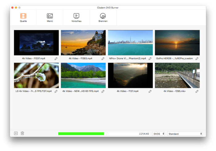 Cisdem DVD Burner kann DVDs von fast allen Videos brennen, wie z.B. MP4, AVI, MOV, MKV, WMV, MPEG, 3GP, VOB, FLV, M2TS, MTS, TS, SWF, MPG, MPA, DAT, DV, NSV, QT, RMVB, DivX, DV, usw., einschließlich der neuesten 4K/5K UHD-Videos. Außerdem unterstützt es heruntergeladene Videos von YouTube, Facebook, Twitter, Vimeo, Dailymotion usw. und mit Camcorder, Kamera, iPhone, iPad und anderen Geräten aufgenommene Videos.