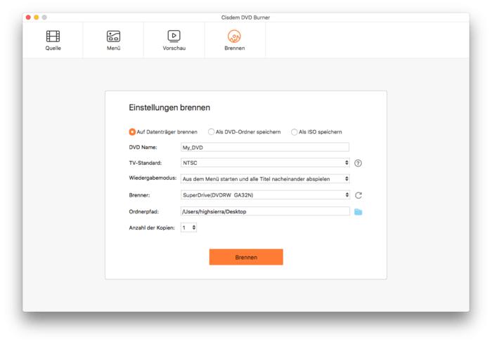 Ein Mausklick genügt, um Videos mit hoher Geschwindigkeit auf DVDs, DVD-Ordner oder ISO-Dateien zu brennen.