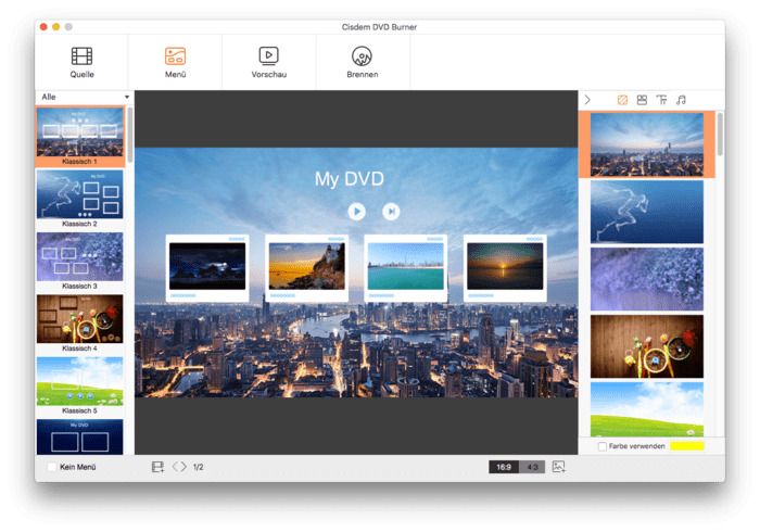 Cisdem DVD Burner stellt Ihnen verschiedene kostenlose DVD-Menüvorlagen für verschiedene Anlässe und Ereignisse zur Verfügung, wie z.B. Klassisch, Weihnachten, Neujahr, Valentinstag, Geburtstag, Hochzeit, Abschlussfeier, Sport, Baby, Reisen und mehr. Sie können ganz einfach eine Vorlage auswählen, die zum Thema Ihrer DVD passt, oder einfach auf ein Menü verzichten. Sie können außerdem das Video-Seitenverhältnis einstellen und das DVD-Menü anpassen. Es gibt 2 gängige Seitenverhältnisse: 16:9 für Breitbild und 4:3 für Vollbild. Sie können den Menühintergrund aus einer Farbe oder einem importierten Bild auswählen, die Titeltaste als Rahmen, Rahmen & Etikett oder Etikett anzeigen, die Menütaste als Symbol, Symbol & Etikett oder Etikett anzeigen oder einfach ausblenden, den Menütext bearbeiten und seine Schriftart, Größe und Farbe festlegen. Für noch mehr Kreativität können Sie sogar Ihre Lieblingshintergrundmusik hinzufügen und einen Ein-/Ausblendeffekt anwenden.
