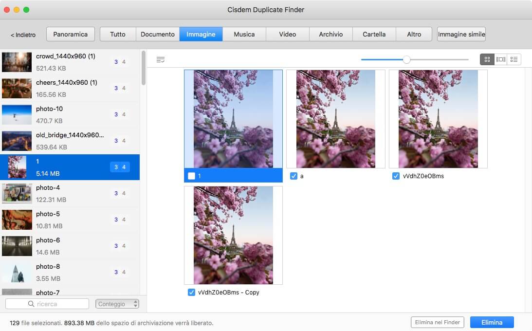 - Consente di visualizzare in anteprima i duplicati trovati affiancati o in dettaglio