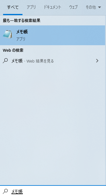 - 「スタート」ボタンをクリックして、メモ帳を見つけます。見つからない場合は検索ボックスに「メモ帳」と入力し探すことができます。