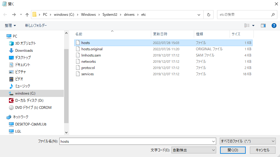 - メモ帳のメイン画面が表示されます。左上すみのメニューで「ファイル」>「開く」をクリックして、「Cドライブ」>「Windows」>「System32」>「drivers」>「etc」フォルダで「hosts」ファイルを見つけて、開きます。