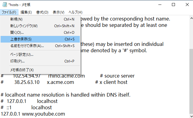 - hostsファイルが開かれます。一番下の行に移動して、「127.0.0.1 www.ブロックしたいサイト名.com」を入力します。ここでは、「127.0.0.1 www.youtube.com」を例に入力します。そして左上で「ファイル」>「上書き保存」(WindowsのOSによって「保存」になっている場合があります。)をクリックして、変更を保存します。