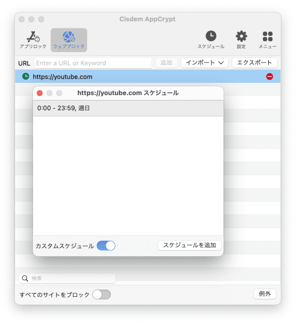 ウェブブロック画面の左下の「すべてのサイトをブロック」を有効にすれば、「例外」>「常に許可」リスト以外のすべてのサイトがブロックされ、Chromeでアクセスできなくなります。この機能でブロックしたサイトは一般スケジュールで管理できますので、設定した時間帯以外では利用できるようになります。親が子供のネット利用を完全管理できます。