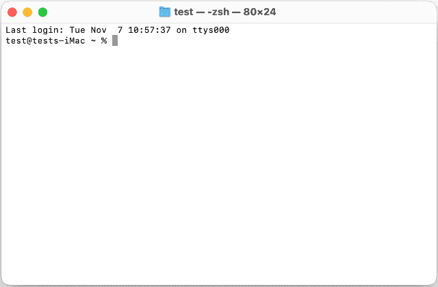 - 「Finder」>「アプリケーション」>「ユーティリティ」フォルダに入り、ターミナルアプリを見つけて、起動します。下記の画面が表示されます。