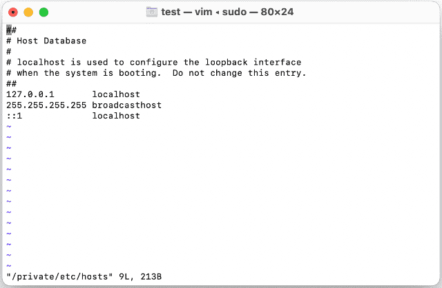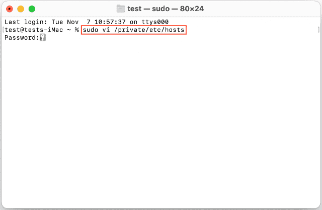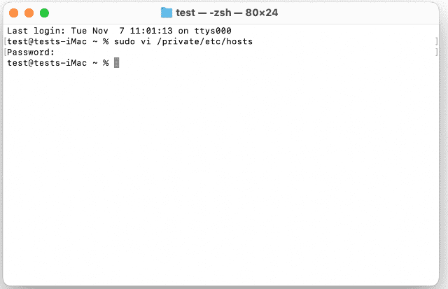 - 「sudo vi /private/etc/hosts」を入力して、Enter(Return)キーを押します。そして下の行に「Password」という文字が表示されます。