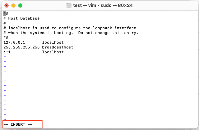 - キーボードで「i」キーを押します。そして下に「INSERT」が表示され、テキストを入力できるようになります。
