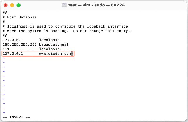 - キーボードの「↓」と「→」を使って、一番下で一番右に移動し、「Enter」キーを押して改行します。そして「127.0.0.1(Tabキー)www.ブロックするサイト.com」を入力します。ここでは例として、「127.0.0.1 www.cisdem.com」を入力します。