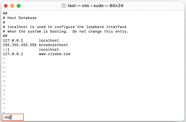 - 最後に「:wq」を入力します。改行などをしなくても入力した文字は最後の行に表示されますので、改行せず直接入力してください。