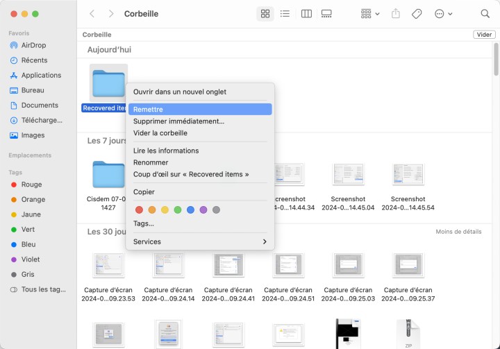 - Faites un clic droit sur le document Word supprimé, puis sélectionnez "Restaurer" pour récupérer le document Word supprimé sur Mac.