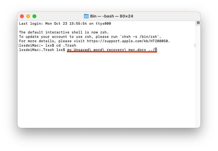 - Tapez mv nom de fichier ../ et cliquez sur la touche Entrée. Par exemple, s’il y a un fichier que vous voulez récupérer et son nom de fichier est "Unsaved word recovery mac" avec un suffixe .docx. La commande doit être "mv Unsaved\ word\ recovery\ mac.docx ../".