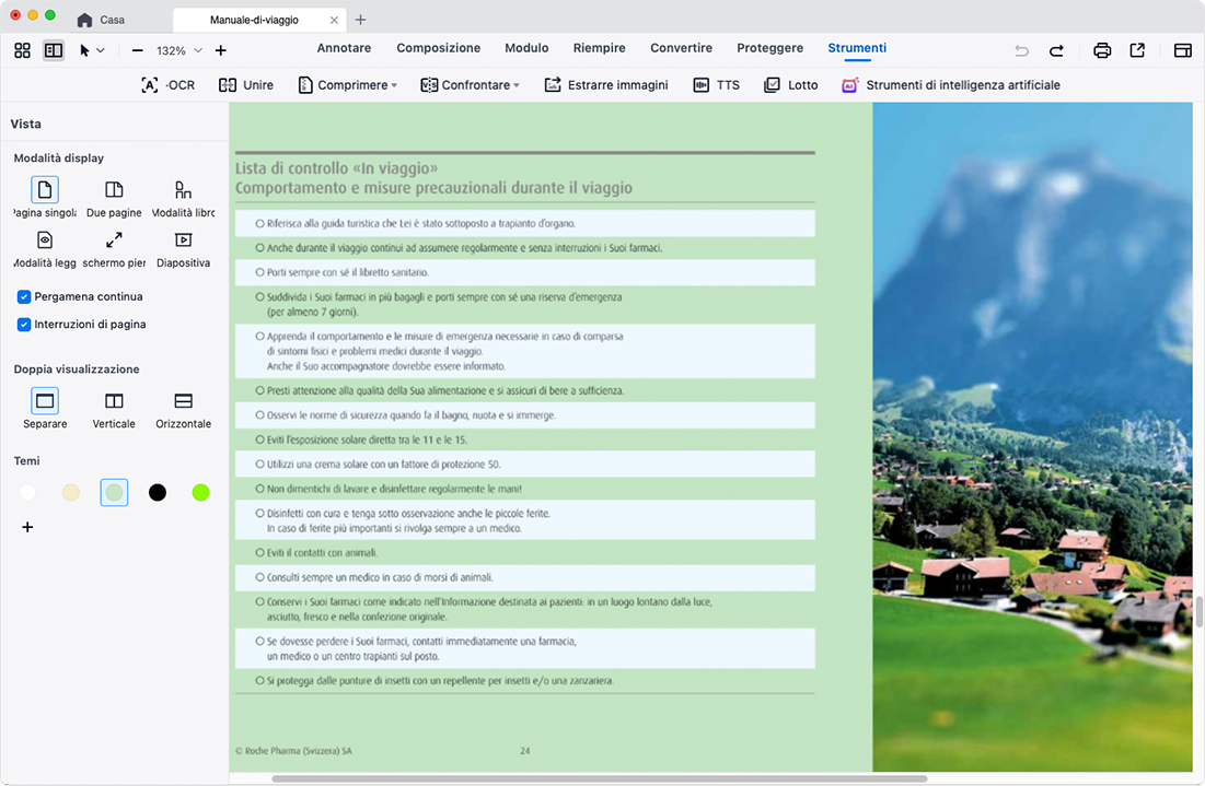Offre molteplici modalità di visualizzazione: pagina singola, due pagine, modalità libro o modalità lettura. Sperimenta un comfort di lettura migliorato con lo scorrimento fluido delle pagine e temi preimpostati, cambia lo sfondo da chiaro, seppia, scuro, reseda, ecc. per alleviare l'affaticamento degli occhi. Supporta la sintesi vocale, così puoi scegliere di ascoltare i file PDF quando sei stanco di leggere, sono supportate oltre 50 lingue.