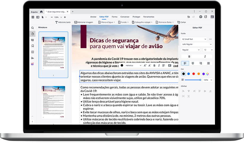 Adiciona novo texto em qualquer parte do teu PDF e modifica o texto existente com formatação, define o estilo da fonte, tamanho, cor ou alinhamento de palavras, frases e parágrafos.