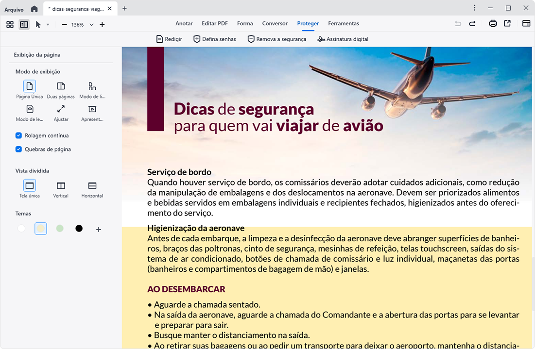 Oferece vários modos de visualização: página única, duas páginas, modo livro ou modo de leitura. Lê confortavelmente com rolagem de página suave e temas predefinidos, além de você poder alterar o plano de fundo entre claro, sépia, escuro e outros, para aliviar a fadiga ocular. Permite converter o texto do seu PDF em fala, para que você possa ouvir os arquivos PDF quando estiver cansado de ler, com suporte a mais de 50 idiomas.